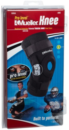 -. Feature : Mueller's patented TRIAXIAL HINGES on both sides of knee / Maximum protection and medial lateral support / Red "extra-stitching" seams / Adjustable patellar buttress creates pressure where you want it, helps control subluxating patella's / Adjustable straps above below knee and tibial pad under lower front strap for support comfort