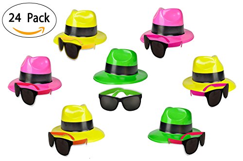 -. Title : 24 Neon Party Supplies Pack - Party Favors Assortment - 12 Neon Sunglasses & 12 Neon Plastic Gangster Hats - Fun Party Toys