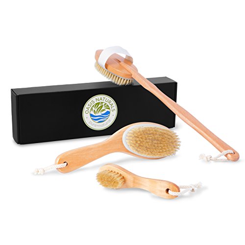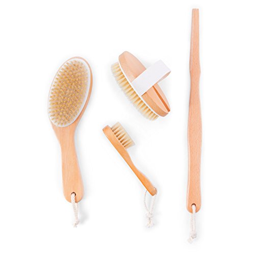 Exfoliating Dry Or Wet Body Wash Brush Set for Dry Brushing, Improving Circulation and Reducing Cellulite to Rejuvenate Skin - 4 Piece Natural Boar Bristle Set