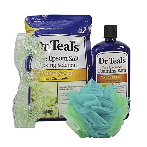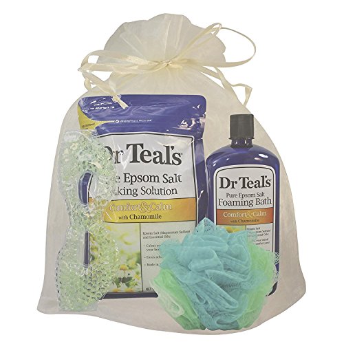 Dr Teal's 4 Piece Bath Set with Pure Epsom Salt Soaking Solution, Foaming Bubble Bath, Sponge, and Gel Bead Eye Mask in Organza Gift Bag (Chamomile Comfort Calm)
