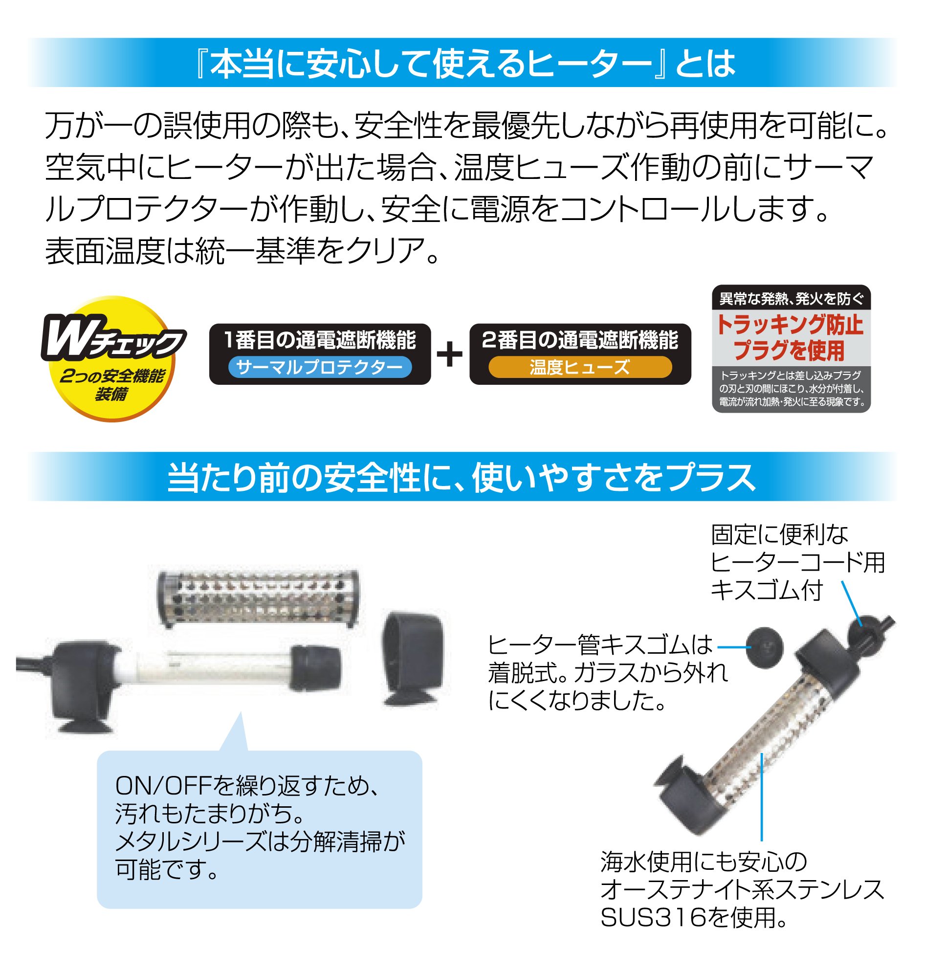Features of the heater · Double blocking function to prevent abnormal heat generation · Tracking prevention plug use · Double kiss rubber to set reliably in the aquarium · With heater cover adopting rust resistant stainless steel <Two safety function equipment> Should be energized