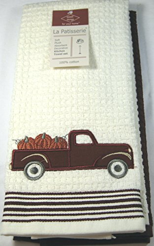 Set of 2 Fall /Autumn Towels 100% Cotton-Cream Waffle w/Harvest Truck and Solid Maroon Waffle