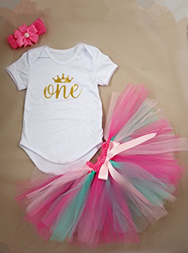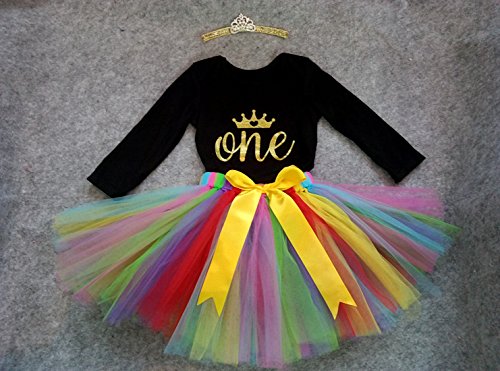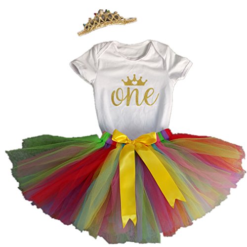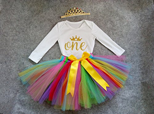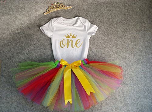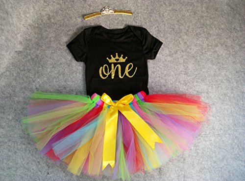 -. Feature : Made of cotton material, soft for baby's skin / Golden "One" and crown on top(L size: 9.05inch for shoulders size, 16.14inch for onesie length, 9.45inch for chest width, 6.29-9.45inch for skirt waist width; XL size: 9.84inch for shoulders size, 16.92inch for onesie length, 10.23inch for chest width, 6.29-9.45inch for skirt waist width ) / This outfit including headband, rainbow tu tu skirt and short sleeves onesie / Very cute for P.R.Incess party, 1st birthday, photos, daily wearing and other special occassions / A perfect gift boutique for your little girls on her first birthday party!