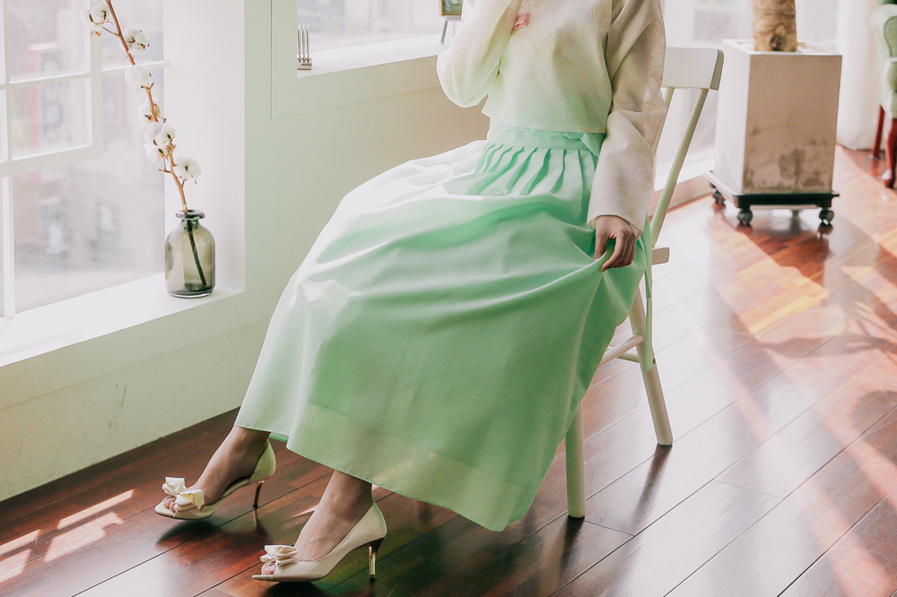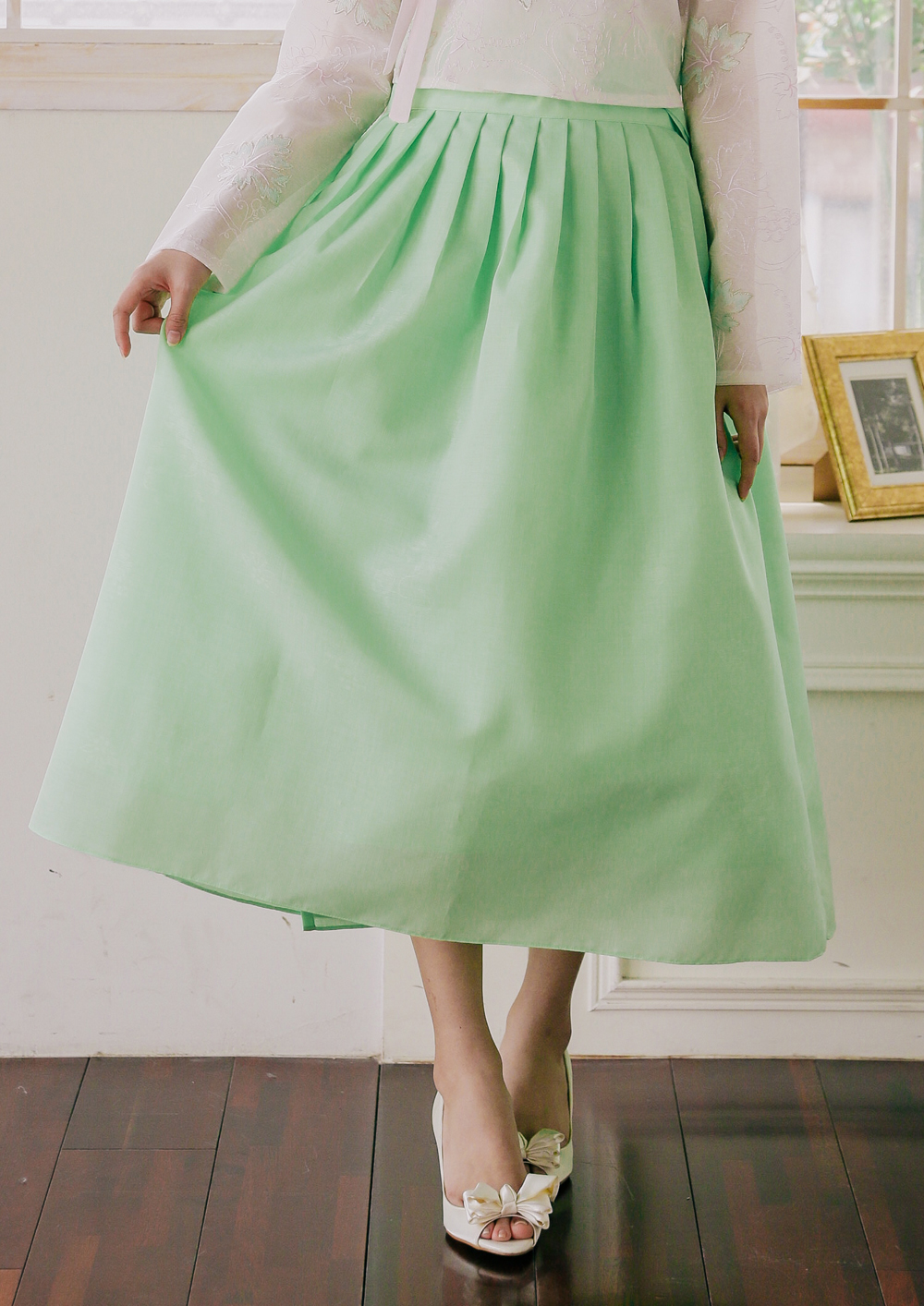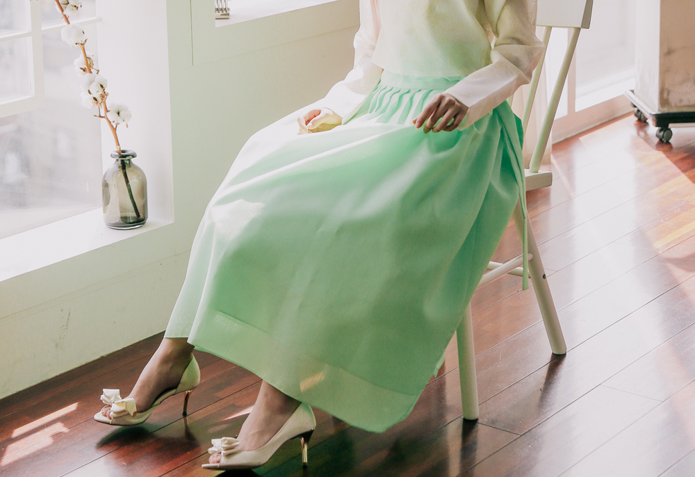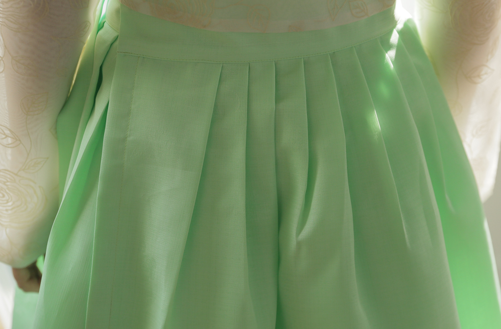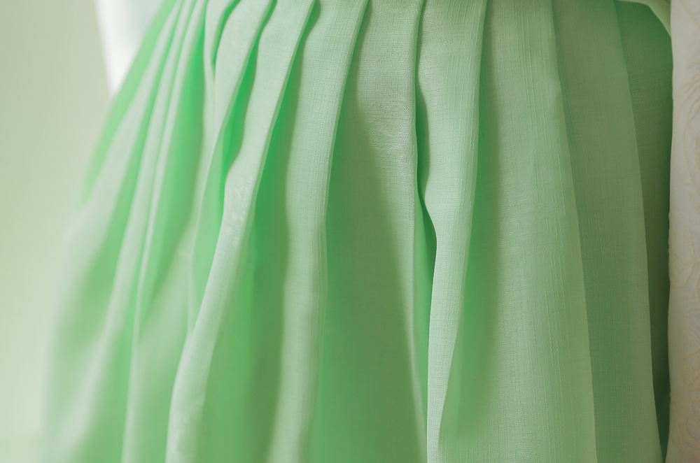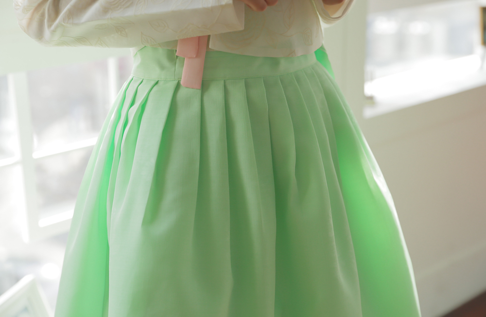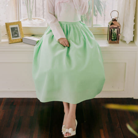 화면상으로만 보이는 민트색이 아닌 고급스런 그린컬러로 싱그러운 느낌을 더해주는 봄그린 허리치마에요