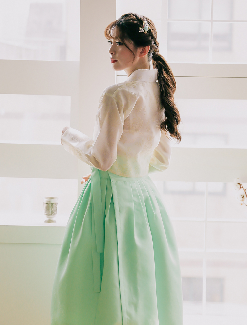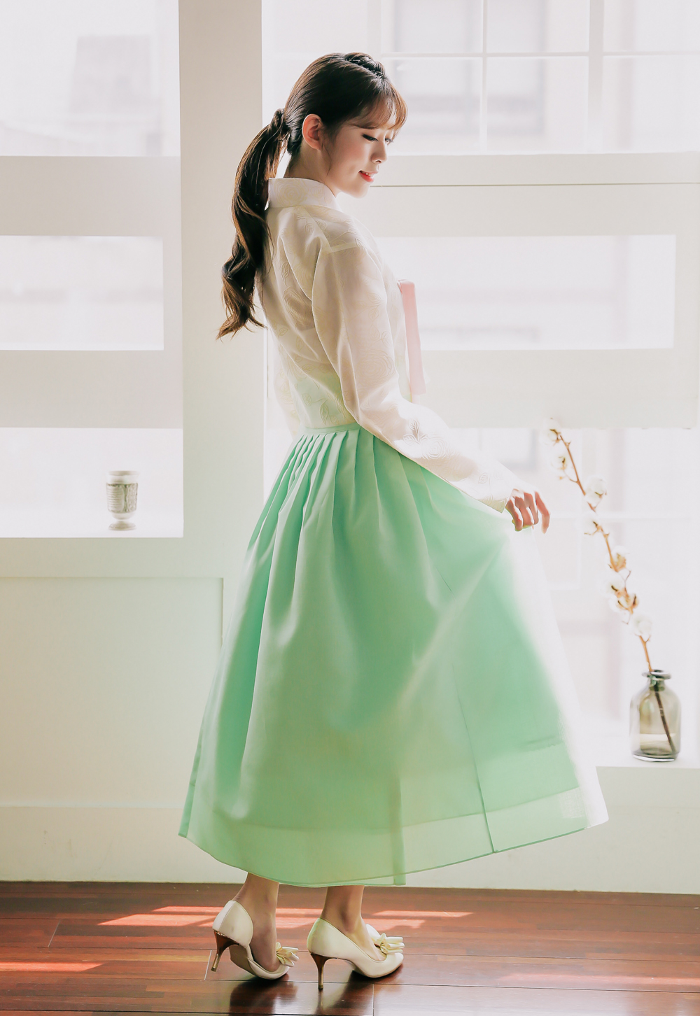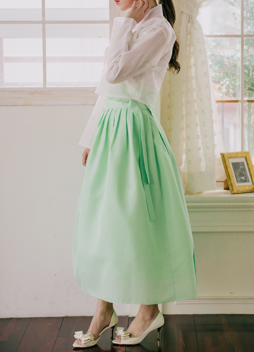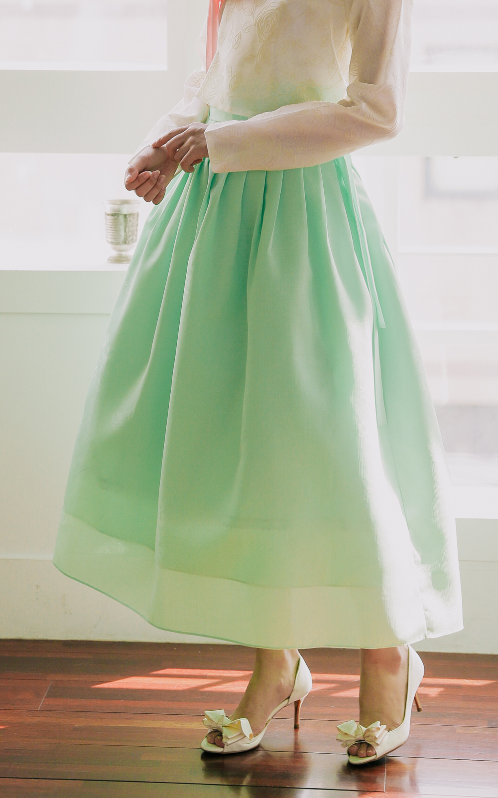 화면상으로만 보이는 민트색이 아닌 고급스런 그린컬러로 싱그러운 느낌을 더해주는 봄그린 허리치마에요