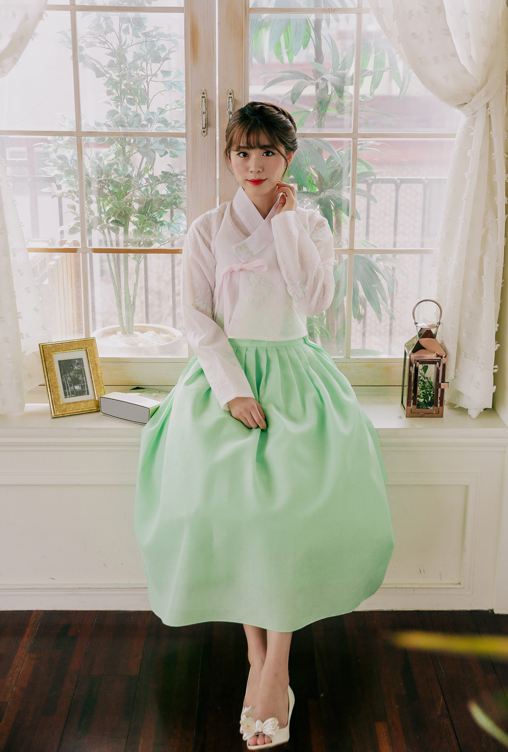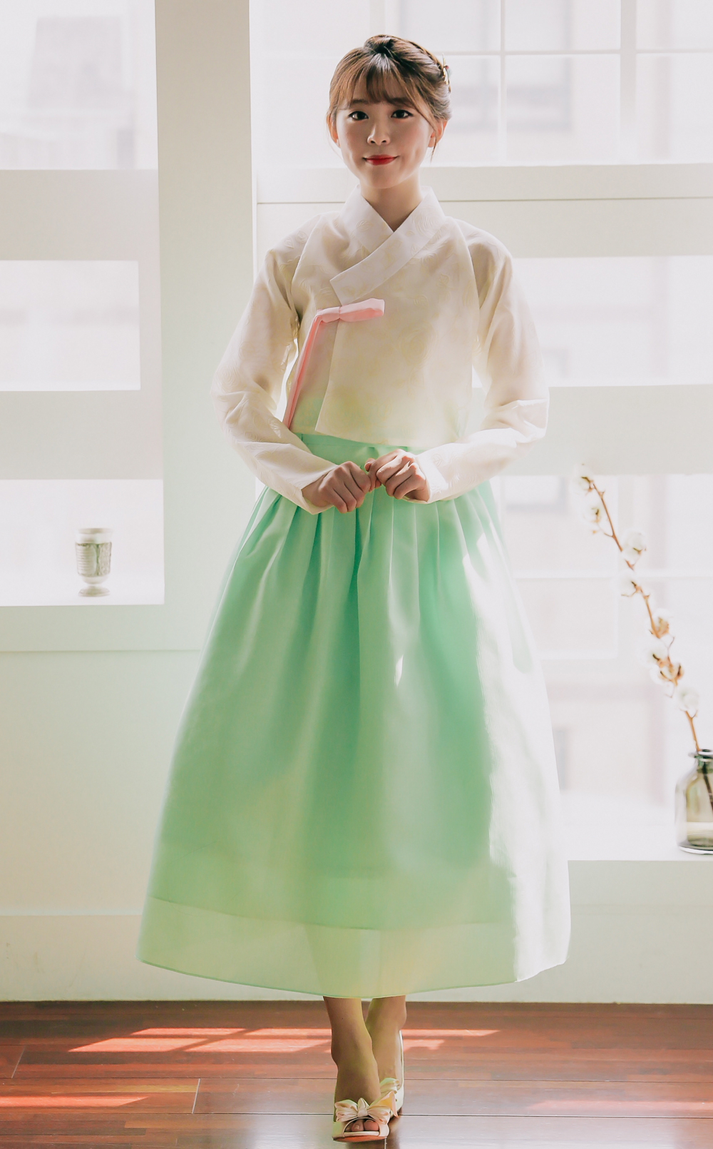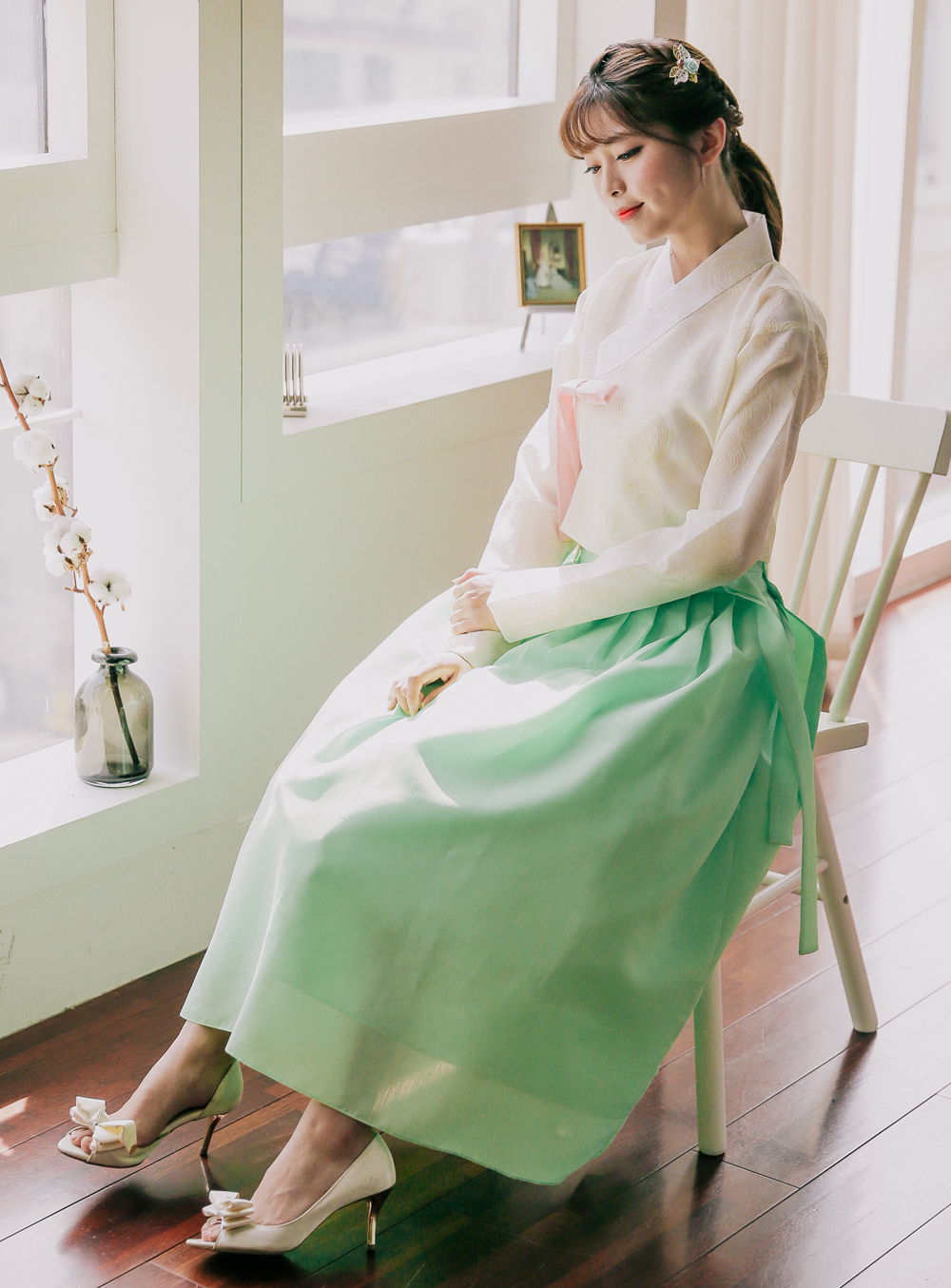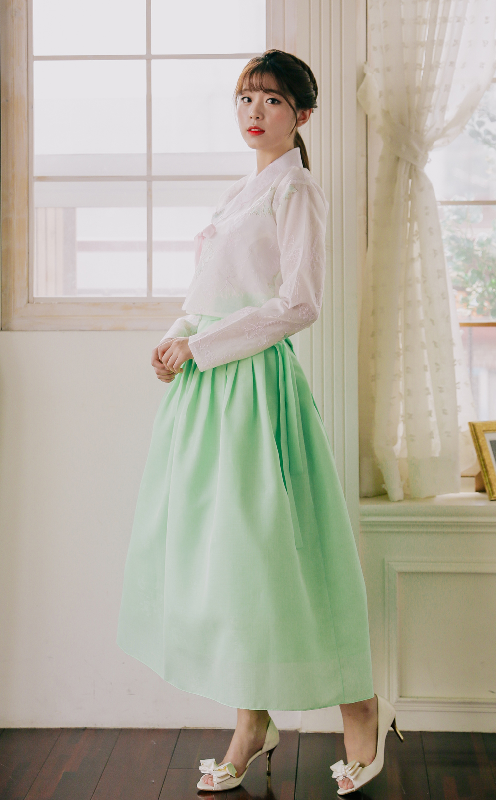 화면상으로만 보이는 민트색이 아닌 고급스런 그린컬러로 싱그러운 느낌을 더해주는 봄그린 허리치마에요