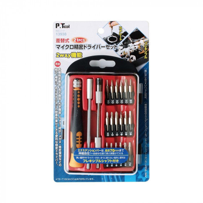 | セット内容 | ドライバーグリップ エクステンションバー (プラス:No.000、No.00、No.0、No.1 マイナス:1.0mm、1.5mm、2.0mm、2.5mm、3.0mm) フレキシブルシャフト (トルクス:T5、T6、T7、T8、T9、T10 6角:H1.5、H2.0、H2.5 ) |