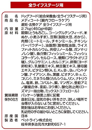 原材料:穀類(とうもろこし、コーングルテンフィード、米ぬか、小麦ふすま)、 豆類(脱脂大豆、おから)、 肉類(ミートミール、チキンミール、チキンレバーパウダー)、 油脂類(動物性油脂、ライスファットカルシウム、共役リノール酸、ガンマ-リノレン酸)、 魚介類(フィッシュミール、フィッシュコラーゲン)、セルロース、 糖類(フラクトオリゴ糖)、グルコサミン、L-カルニチン、 卵類(ヨード卵粉末)、 乳酸菌エキス、納豆菌エキス、酵母菌エキス、ビタミン類(A、E、K3、B1、B2、パントテン酸、ナイアシン、B6、葉酸、ビオチン、B12、C、コリン)、ミネラル類(カルシウム、リン、ナトリウム、塩素、鉄、コバルト、銅、マンガン、亜鉛アミノ酸複合体、亜鉛、ヨウ素)、酸化防止剤(ローズマリー抽出物、ミックストコフェロール)