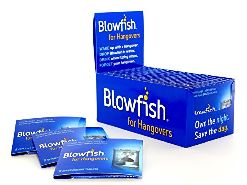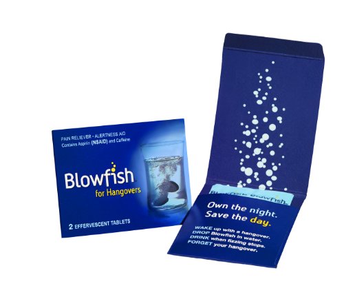 -. Binding : Health and Beauty -. Brand : Blowfish -. Color : Gray and Blue -. EAN : 0375920000011 -. Feature : Pain reliever and alertness aid specifically designed to treat hangovers. / Effervescent tablets are taken upon waking. / Contains aspirin and caffeine, which are recognized by the FDA's over-the-counter monograph on overindulgence as safe and effective for treating the symp associated with a hangover. / One box treats 25 hangovers. / Lemon flavored. -. IsAdultProduct : 0 -. Label : Blowfish -. Manufacturer : Blowfish -. Model : 75920-0464-6 -. MPN : 75920-0464-8 -. PartNumber : 75920-0464-8 -. ProductGroup : Health and Beauty -. ProductTypeName : HEALTH_PERSONAL_CARE -. Publisher : Blowfish -. Studio : Blowfish -. Title : Blowfish for Hangovers (50 Tablets) -. UPC : 375920000011