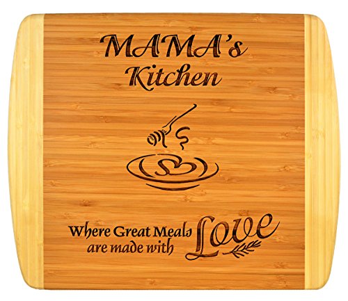 - GIFT FOR MAMA / GRANDMA / MOM / MOTHER– A Specially Designed Mama 2-Tone Bamboo Cutting Board with Custom Engraving that reads “Mama’s Kitchen Where Great Meals are made with Love”. With a Special Heart Shaped Dish Design in the Middle to express your love for Mama! A Special Heart Felt Gift for Grammy, GiGi, Nana, MiMi, Grandmother, Mama Bear or any special Grandma loved one.