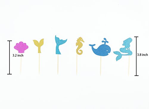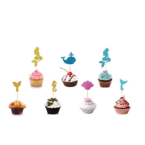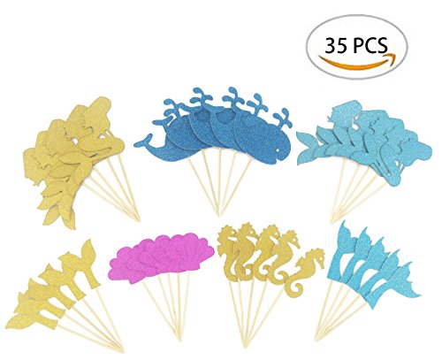 Maydolbone 35pcs Super Glitter Mermaid Theme Cupcake Muffin Topper Picks Cake Decoration Baby Shower Birthday Party Favors, Including Mermaid, Seahorse, Shell, Dolphin, Fishtail
