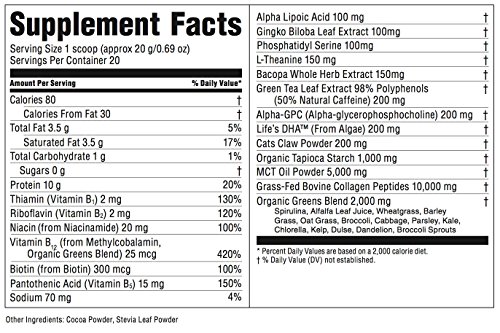 -. Feature : EFFECTIVE NEUROTROPICS -- We use a blend of natural nootropics including alpha lipoic acid, bacopa, gingko biloba, phosphadityl serine, alpha GPC, theanine, algal DHA, cats claw, green tea extract and caffeine from green tea for maximum cognitive output. / GRASS-FED COLLAGEN - We pair 10 grams of 100% grass-fed collagen with our nootropics to support healthy recovery of soft tissues, joints, ligaments, nails, skin, and the walls of the vascular system. Our collagen comes from the USA, is grass-fed, and an excellent source of protein. / MCT OIL POWDER -- We use 5 grams of MCT oil powder per serving, which helps give immediate and lasting energy that is preferred by the brain. Each serving of our MCT oil powder uses 1.5 grams of acacia fiber, which is a prebiotic fiber that promotes gut health. / ORGANIC GREENS - We have 2 grams of 100% organic greens from spirulina, alfalfa, wheatgrass, barley grass, broccoli, kale, chlorella, parsley, kelp, dulse, and broccoli sprouts that feed your cells with the micronutrients they need to activate the receptors in all cells. / CLEAN ENERGY -- We don't use any artificial flavoring, sweeteners, chemicals, binding agents, or any weird stuff so your body gets the blend we've created for you and nothing that can dampen your performance. Just clean, lasting energy for your brain and your body.