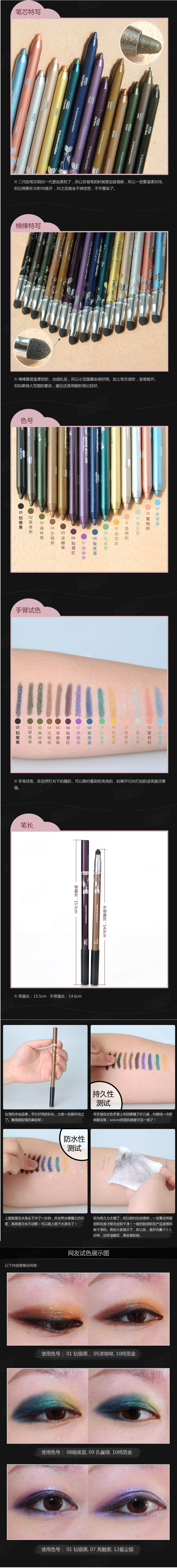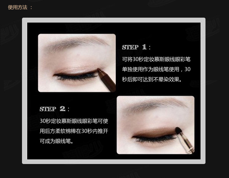 30秒定妆,持久一整天不脱落。眼影+眼线两用笔,附有海绵推棒,可于30秒内晕染成眼线。防水防油,抗晕染配方。
