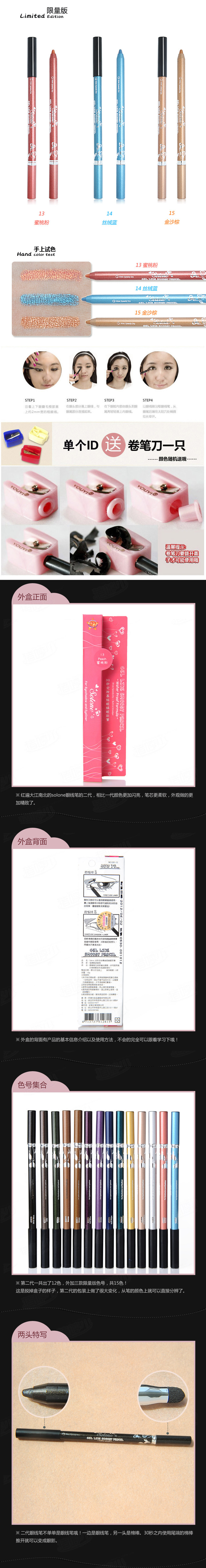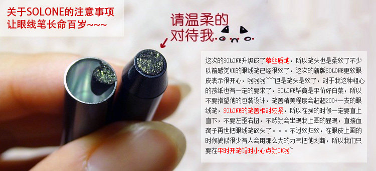使用方法:注意哦!因为新的2代的慕丝笔比一代更软更容易上色,但是可避免的就是在卷的时候笔芯比一代更容易断,所以一定要温柔对待。这种软芯的都是这样的~~再大牌的都是这样~~如果介意卷的时候比较容易断芯的就选一代买吧。在卷的时候需要注意的是,不能太用力把眼线笔往卷笔刀里面“塞”。因为眼线笔的笔头和铅笔不一样,比较软,如果太用力,笔头很容易断里面。大家卷的时候要把力量用在“卷”这个动作上,而不是“塞”这个动作上。而且卷的时候卷的时候要注意观察笔头。不要把笔头卷的太尖,大概卷一圈这样就可以了,就算在大牌的这样软芯的眼线笔,如果当铅笔卷那是肯定都要断掉的。