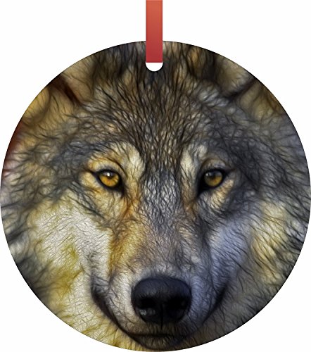 Lea Elliot Wolf Face Up Close Flat Round Shaped Holiday Hanging Tree Ornament, Semi Gloss, Made in the USA