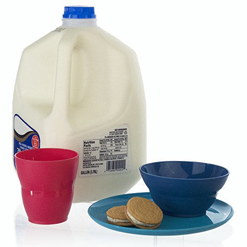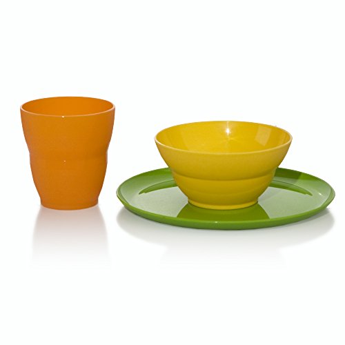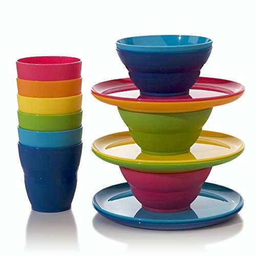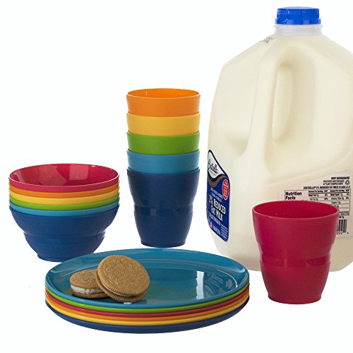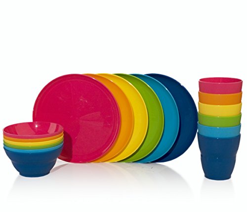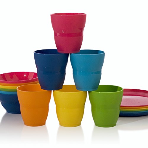 SNACK TIME! Premium quality plastic snackware set of 18 includes (6) 7 ounce juice cups, (6) 4-1/4" bowls, and (6) 7" plates in 6 assorted colors.