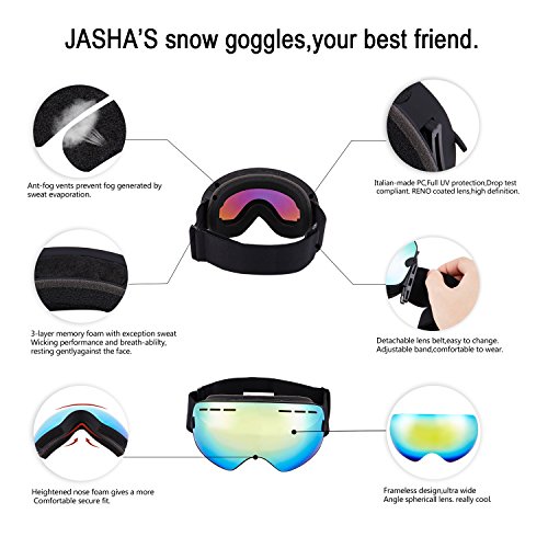 Studio : JASHA'S Publisher : JASHA'S Product Description WHY CHOOSE JASHA'S SKI GOGGLES: Anti fog Treatment The inner surface of the lense is coated to reduce logging and to maintain clear vision.Notice:after repeated use, fogging may occur,this is not a normal phenomenon among all ski goggles.
