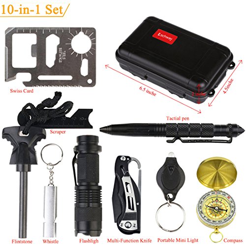 Eachway Professional 10 in 1 Emergency Survival Gear Kit Outdoor Survival Tool with Fire Starter Whistle Survival Knife Flashlight Tactical Pen etc for Outdoor Travel Hike Field Camp