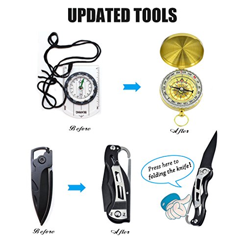 MUST HAVE CAMPING GEAR FOR EVERY ONE:Includes compass, extra loud emergency whistle, fire starter fire scraper and knife flashlight tactical pen etc. Ideal for those who loves outdoors & activities such as hiking, trekking,hunting and more.