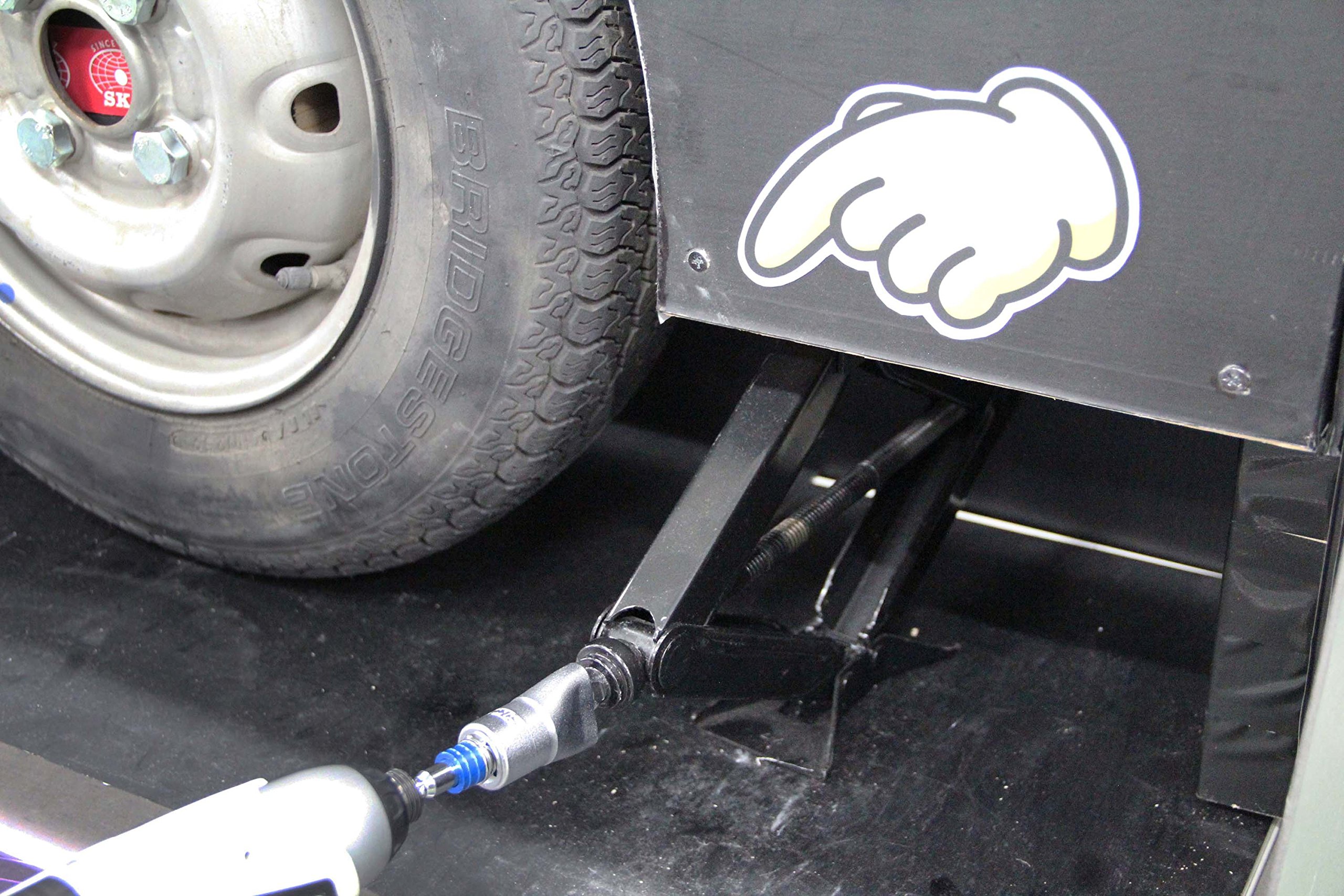 Car jack up with impact driver (wrench), detachment of wheel nut by using sold separately sold wheel socket