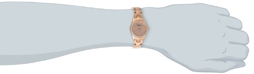 Dress watch, Japanese quartz movement, Polished rose-gold-tone hands with luminous accents, Polished rose-gold-tone sweep seconds, Applied polished rose-gold-tone Arabic twelve, Applied polished rose-gold-tone triangular hour markers at three, six and nine o'clock positions, Rose-gold-tone pave crystal dial, Brushed rose-gold-tone stainless steel bracelet with polished inserts, adjustable links and push-button-clasp, Polished rose-gold-tone stainless steel bezel encrusted with crystals, Polished rose-gold-tone stainless steel round case, Textured rose-gold-tone steel crown, Stainless steel caseback, Mineral crystal with black logo, 3 ATM (30 meters/100 feet water resistant)Feature