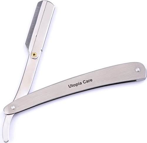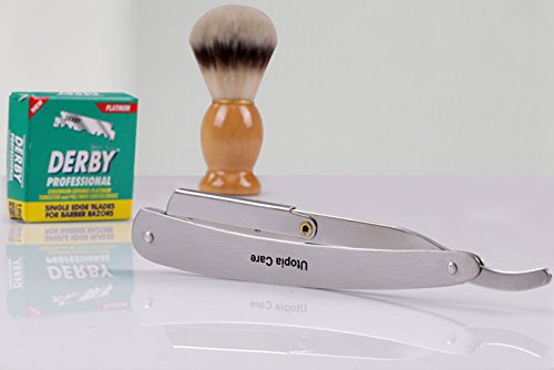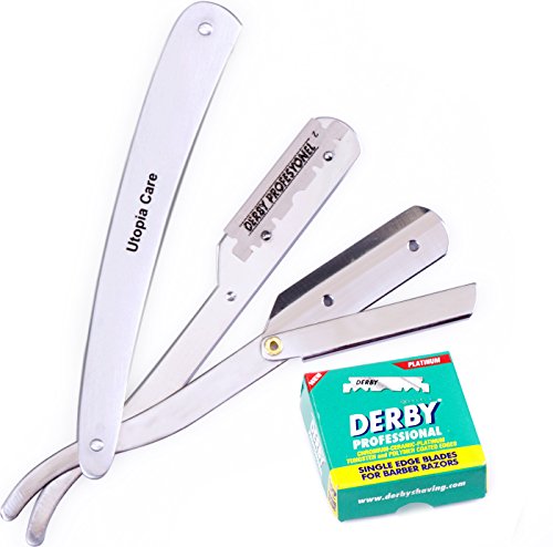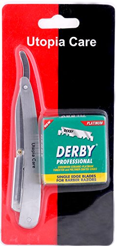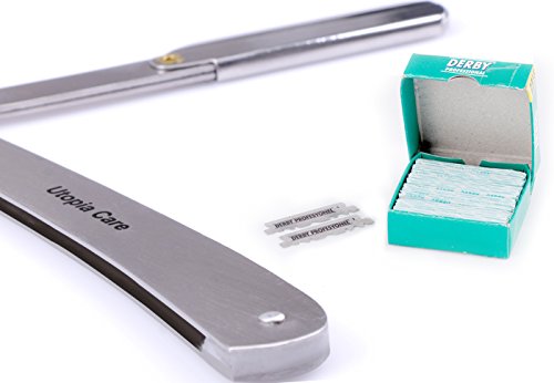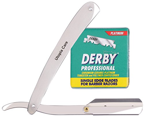 STRAIGHT EDGE BARBER RAZOR WITH 100 DERBY BLADES - SALON QUALITY SMOOTH SHAVE - 100 PERCENT STAINLESS STEEL - REPLACEMENT BLADES EXTEND LIFE OF SHAVER - RESISTS TARNISH AND RUST - BY UTOPIA CARE