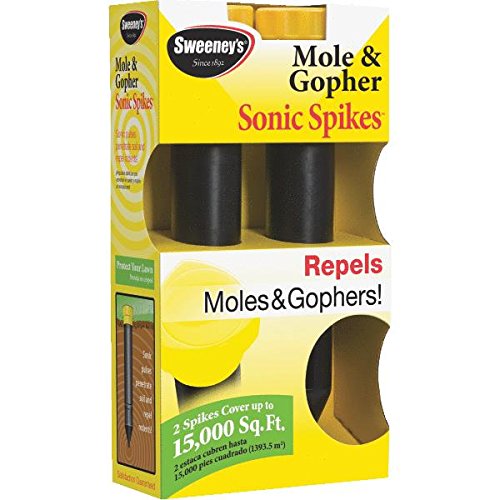 -. Binding : Kitchen -. Brand : Woodstream -. Feature : 2 Twin pack of Sonic Spikes that repels moles and gophers without chemicals or poisons / Emits a sonic pulse that penetrates soil every 30 seconds / Produces a sound that's highly irritating to moles and gophers / Includes removable battery sleeve for easy battery replacement / Treats up to 15,000 square feet; runs for 4 to 6 months on D batteries -. Label : Woodstream -. Manufacturer : Woodstream -. MPN : S9012 -. PartNumber : S9012 -. ProductGroup : Home -. ProductTypeName : HOME -. Publisher : Woodstream -. Size : 1 -. Studio : Woodstream -. Title : Woodstream S9012 Mole & Gopher Sonic Spikes, 2-Pk.