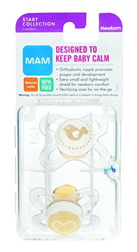 -. Binding : Baby Product -. Brand : MAM -. Color : White -. Department : baby-boys -. EAN : 0845296004048 -. Feature : Two BPA-free pacifiers, extra small and lightweight design / Curved shield allows the pacifier to sit comfortably on baby's face / MAM Ultra Soft Latex Nipple stays comfortably in baby's mouth / Symmetrical nipple ideal for baby's jaw development / Textured surface and multiple small openings on the pacifier shield allow air to circulate and baby's skin to breathe -. Label : MAM -. Manufacturer : MAM -. Model : 0404-012-0-1 -. MPN : ERZB-774499 -. PackageQuantity : 1 -. PartNumber : ERZB-774499 -. ProductGroup : Baby Product -. ProductTypeName : BABY_PRODUCT -. Publisher : MAM -. ReleaseDate : 2013-06-04 -. Studio : MAM -. Title : MAM Newborn Latex Start Orthodontic Pacifier, Unisex, 0+ Months, 2-Count -. UPC : 845296004048