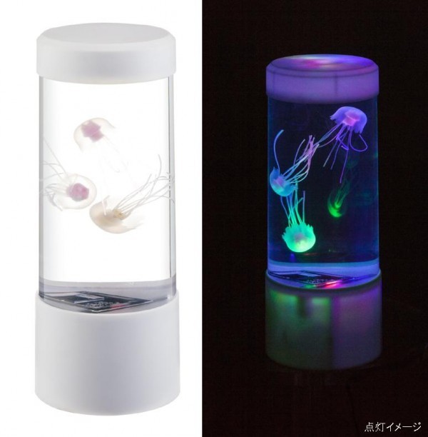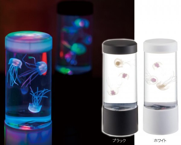 | 本物そっくりのクラゲが、LEDライトで光りながらゆらゆらと浮遊します。単三乾電池×3本、家庭用コンセントのどちらでもご使用いただけます。 |