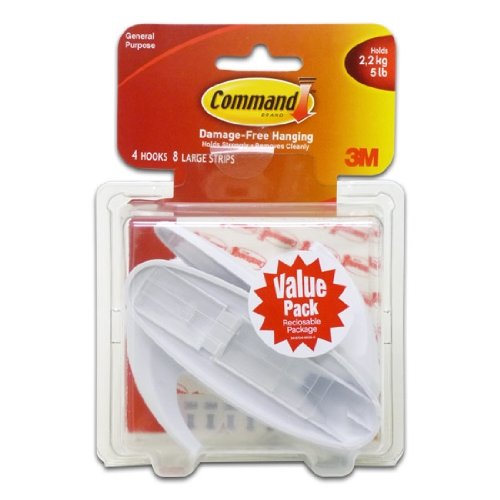 -. Brand : COMMAND -. EAN : 0051141383811 -. Feature : Hanging hooks hold strong to flat surfaces / Removes cleanly without surface damage / Hooks work on a variety of surfaces / Sold in a convenient pack of four / Easy to apply and remove--no tools required -. Label : command -. Manufacturer : command -. ProductGroup : Home Improvement -. ProductTypeName : HARDWARE -. Publisher : command -. Size : 4 Large Hooks -. Studio : command -. Title : Command Large Plastic Hooks Value Pack -. UPC : 051141383811