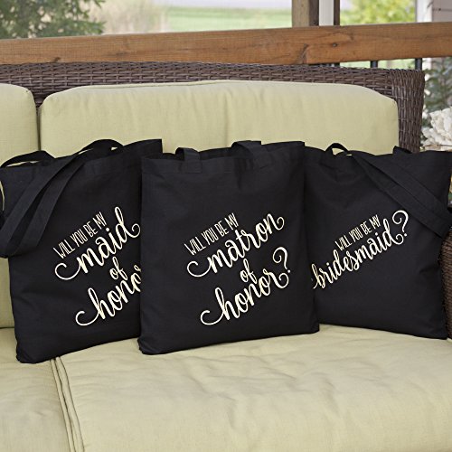 - Black cotton Tote bag with cream color silkscreened text: will you be my Matron Of Honor