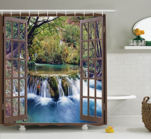 House Decor Shower Curtain Set by Ambesonne, Wide Waterfall Deep down in the Forest Seen from A City Window Epic Surreal Decorative Print, Bathroom Accessories, 75 Inches Long, Multi