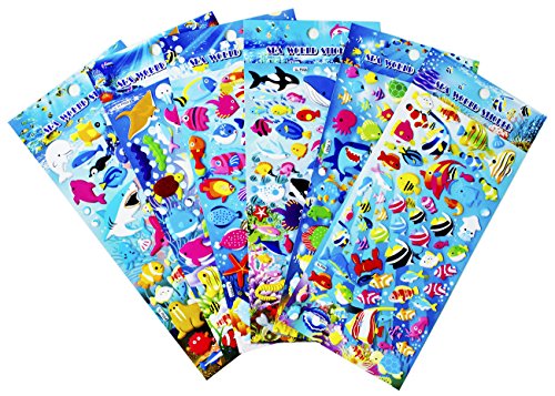 Happy Underwater Sea World Stickers 6 Sheet with Angelfish, Sharks, Starfish, Hippocampus - PVC Ocean Foam Fish Stickers for Kids - 240 Stickers