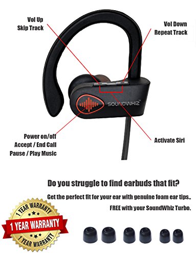 -. Feature : ✓ IPX7 CERTIFIED WATERPROOF. Protected against sweat and water, Turbo can handle heavy-duty sweat and safe guard your headphones against water - don't let the rain stop you! / ✓SUPERB SOUND. HD crystal clear sound, advanced audio drivers Bluetooth 4.1 and CVC6 noise cancelling tech offer echo elimination that delivers 8 hours crisp, clear acoustics and HiFi stereo sound. / ✓ BEST WIRELESS BLUETOOTH EARBUDS FOR SPORT, workouts and running. Good bass, robust design, it's the ultimate wireless fitness sweat proof headphone. Experience stereo sound from a flexible 33 feet from your cell phone and zone in to true wireless audio. Custom your secure fit with a choice of silicone and foam ear tips. Soft ear hooks + size tangle free cord with adjustable cable clip makes Turbo the best earphone for exercise / ✓ FEATURE BENEFITS: TALK & GO - The HD microphone allows this wireless earbud to double as a headset. Voice prompt using Siri or Google Now. The latest CSR Chipset means clear quality sound, long battery life & quick charge, + 180 hrs standby and iPhone on-screen power view. Dual pairing it connects with any Bluetooth device including iPhone 4s/5s/6/6s, 6 Plus/6s plus, iPad Air, Samsung Galaxy S6,S5,S4, HTC, LG, & Other Android, IOS PCs & windows Smart phones / ✓ RISK FREE, FAST DELIVERY. Ships from the US with 30 Day Money Back Guarantee, Plus 12 Month Replacement Warranty as standard. BONUS OFFER for a limited time we are offering FREE upgrade to a LIFETIME WARRANTY - see inside pack for details.