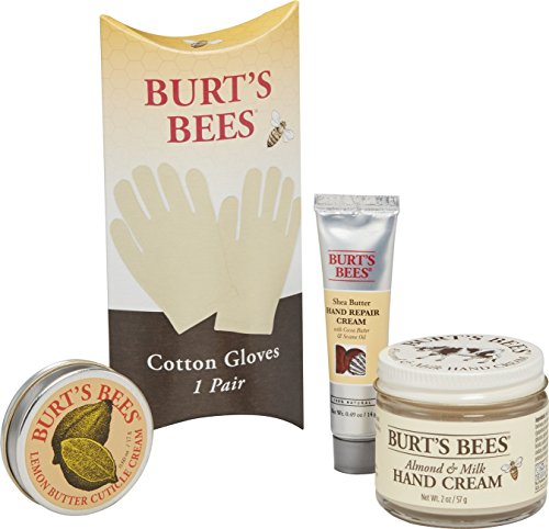 -. Feature : Includes 0.25 ounce Almond Milk Beeswax Hand Cream 0.30 ounce Lemon Butter Cuticle Cream and 0.49 ounce Shea Butter Hand Repair Cream / Gift pack contains 3 popular Burt's Bees hand care products / Also contains 1 pair of cotton gloves / Hand repair kit treats hands with natural ingredients / Look to Burt's Bees for great gift ideas / One kit containing shea butter hand repair creme, almond milk hand crème, lemon butter cuticle creme, gloves, and instruction booklet / Shea butter reduces wrinkles and protects skin from environmental aging / Cotton bee gloves for intensive treatment (design may vary) / Produced in Durham, North Carolina / Not tested on animals