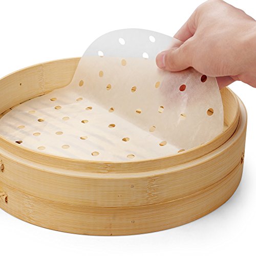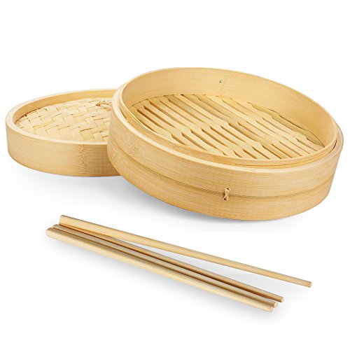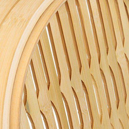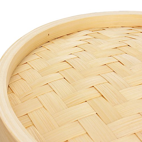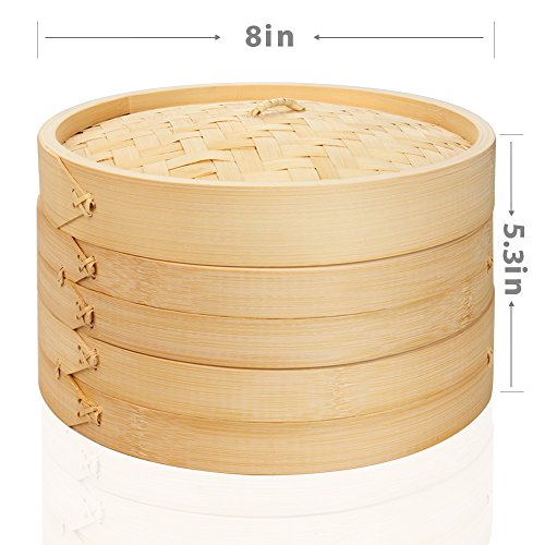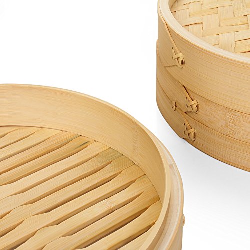 Stackable 2 tiered steamer baskets made of woven bamboo; the bamboo wood steamer is sturdy and water resistant