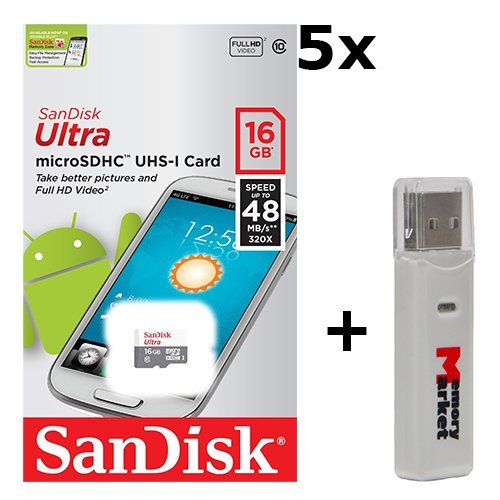 5 PACK - SanDisk Ultra 16GB UHS-I Class 10 MicroSDHC Memory Card Up to 48mb/s SDSQUNB-016G LOT OF 5 with USB 2.0 MemoryMarket dual slot MicroSD & SD Memory Card Reader