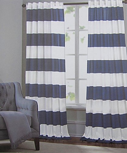 Hillcrest Wide Stripes Curtains 2 Panels 52 by 96 inch Nautical Cabana Stripes Modern Window Drapes Cotton 2 Panels Hidden Tabs Navy Blue White