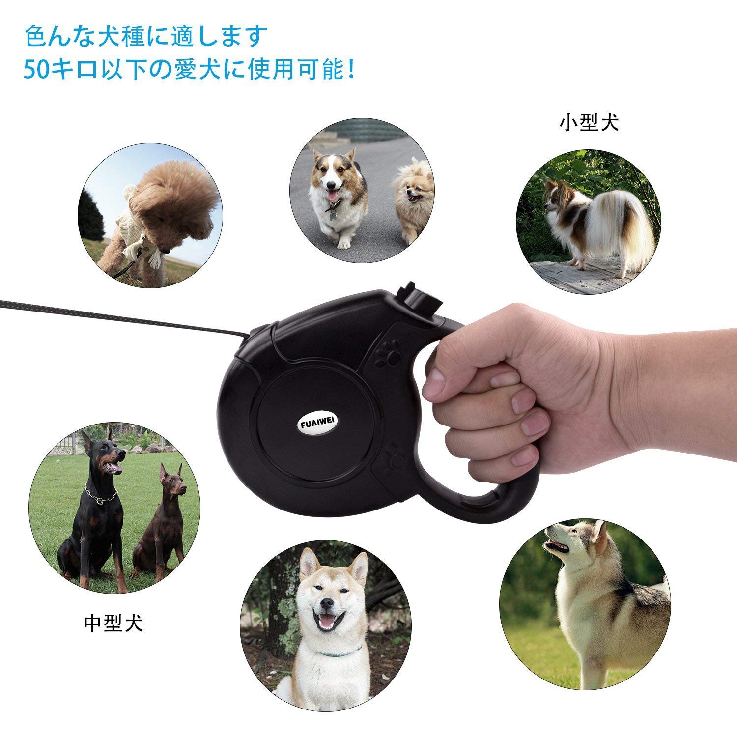 【5メートルの巻き取り式設計】最長5メートルまで引き伸ばせますので、動ける範囲が広がり、愛犬をコントロールしながらいつものお散歩より開放的に自由になります。また簡単に格納やお好みの長さへの調節ができます。