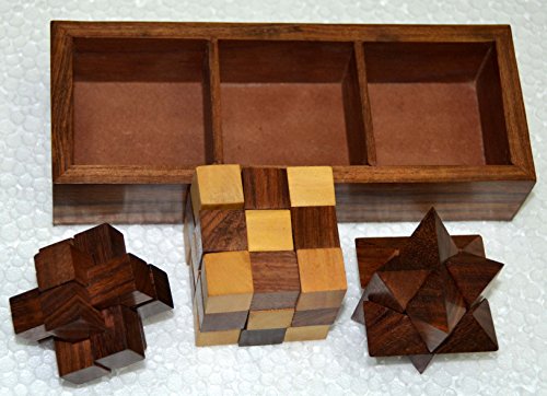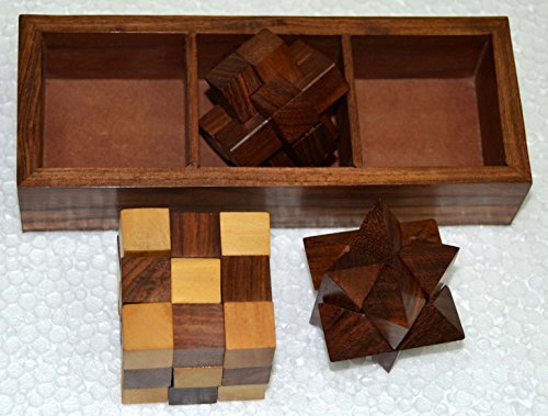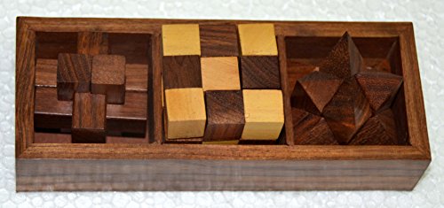 Studio : Brass Nautical Publisher : Brass Nautical Binding : Toy Product Description What's better than having a puzzle game at the ready to help you pass the time? How about having three challenging games? The 3-in-One Wooden Puzzle Games Set triples the fun by giving you three puzzle games that you can play at home or at the office. Perfect for passing the time on a rainy day, taking a break from the stresses of your day and keeping your mind sharp, this set is sure to delight any adult or teen. The puzzles included in the 3-in-One Wooden Puzzle Games Set are three dimensional building games. Each one consists of a wooden pieces, which are designed to be fit together to create a finished three-dimensional shape. Solving the puzzle takes patience and skill, and you can enjoy putting the pieces together again and again. The set includes a diagonal burr, a snake cube and interlocking blocks. With the 3-in-One Wooden Puzzle Games Set, you'll never have to worry about pieces becoming lost or damaged. The set includes a wooden tray with three compartments, so that you can keep the loose pieces or the assembled puzzles inside until you're ready to play again. The tray measures 7 inches by 2.5 inches in size and is made from the same high quality sheesham hardwood as the pieces. Constructed entirely by hand, the 3-in-One Wooden Puzzle Games Set shows off Indian woodworking at its finest. This set is so attractive that it can easily be used as a decoration in a den, family room, office or waiting room. It's also a favorite table game for cafes and coffee shops. Because the pieces and the storage box are handcrafted, you're guaranteed to be impressed with the quality of the game set. See if you have what it takes to assemble three challenging 3D puzzles or put someone special to the test! Order the 3-in-One Wooden Puzzle Games Set for yourself or to give as a gift for any occasion. 0