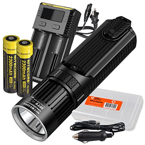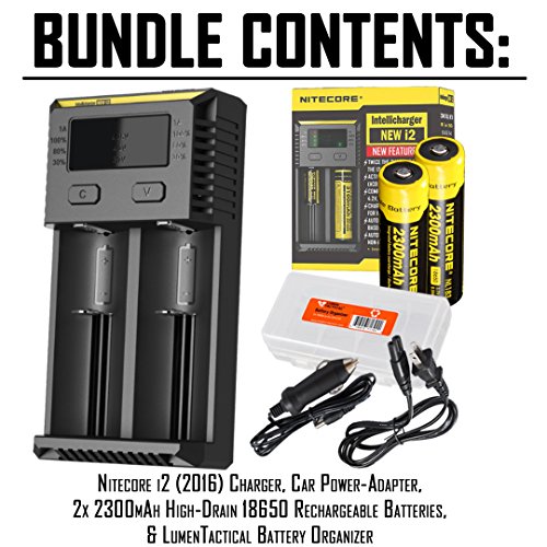 - CHARGER BUNDLE - Package contents & accessories include: Nitecore SRT9 Tactical Flashlight, Holster, Lanyard, Removable Clip, Spare O-ring, Tail-cap, & Rubber Cushion PLUS: 2x Nitecore 2300mAh High-Drain 18650 Rechargeable Batteries, Nitecore i2 (2016 ver.) 2-Port Battery Charger, Car A/C Adapter, & LumenTac Battery Organizer (holds 2x 18650 batteries or 4x CR123A batteries)
