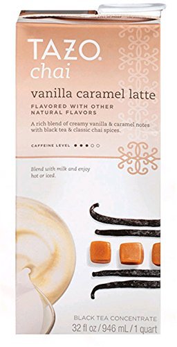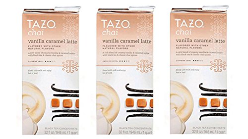 -. Feature : Delicious Tazo Chai Vanilla Caramel Latte Black Tea Blend Concentrate / Blend with Milk and Enjoy Hot or Iced / 32 fl oz x 3 = 96 fl oz total (3 containers) Value Pack / 31-45 mg of Caffeine (Medium Caffeine Level) / Dairy-Free Mix- use with milk or any milk alternative