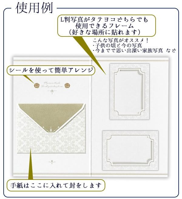 L判写真を収納できるフレームがついた結婚式用のレターセットです。フレームは好きな場所に貼れるので、タテヨコどちらでも使用可能。付属のシールを使えばアレンジも簡単!!レター裏面には本体表紙や封筒と同じ華やかな柄が入っています♪ |
