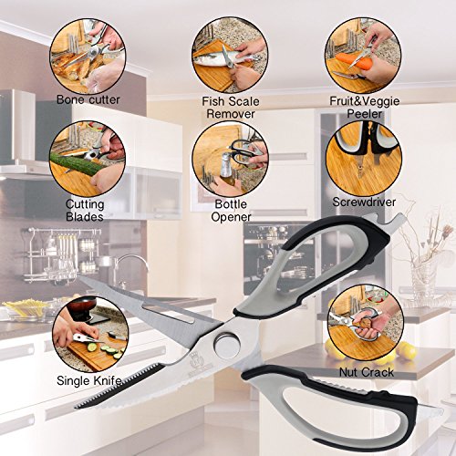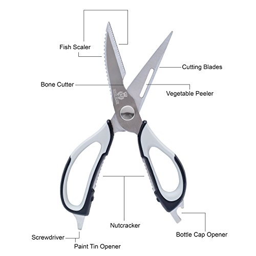DESIGNED TO MAKE YOURS LIFE EASIER - MULTI TASKING 8 - IN 1 We Used This Shears&Scissors For : Cut Fruit & Vegetable , Remove Fish Scales/Cheese Grater ,Snip Sharp Bones, Crack Nuts, Peel Fruit&Vegetable, Cut Meet, Open Bottles ,Screws Tightening