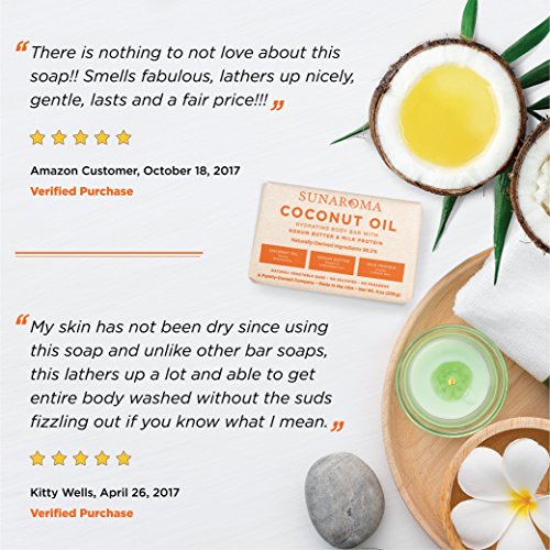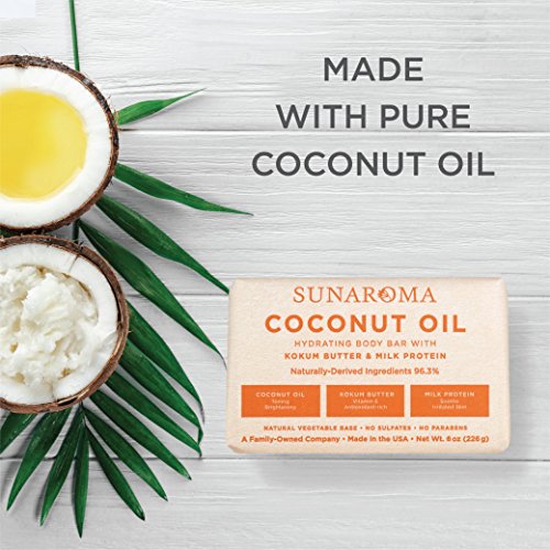 Reveal brighter, younger-looking skin as the body’s biggest organ, our skin is constantly exposed to the harsh cleansers, free radicals and uv rays that can cause irritation and premature aging. While we can’t always keep our skin out of harm’s way, we can help repair existing damage. Breathe life back into your complexion with a bar of organic coconut oil soap from SUNAROMA as a superfood for your skin, coconut oil’s fatty acids lock in natural moisture for a complexion that’s soft and smooth to the touch. Also rich in lauric acid, this creamy soap effectively cleans the pores and promotes a brighter, more toned complexion. To amplify the moisturizing properties of coconut oil, we paired it with velvety kokum butter it’s rich in antioxidants and vitamin E, making it a powerful aid in repairing damaged skin and reducing the signs of aging. Milk protein gently soothes irritated and delicate skin, making our blend a great choice for anyone who wants a more youthful glow while most soaps on the market contain harsh chemicals and fillers, our formula is paraben and sulfate free we use only premium ingredients and craft our bars in the USA, ensuring that you receive a product that’s as safe as it is ethical. Why choose our coconut oil soap? - Brightens and tones the complexion. - Locks in natural moisture. - Helps repair damaged skin. - 100% vegetable base. - Paraben, sulfate and cruelty free. Supply is limited. Order today to ensure availability. Order your soap now and bring your complexion to life by maintaining your skin's natural moisture levels, our rich formula tones, brightens and leaves your skin full of life. Thanks to its high concentration of vitamin E, kokum butter helps repair dry and damaged skin, helping you fight fine lines, winkles and dark spots. This non-irritating ingredient is rich in amino acids, making it an effective way to boost collagen, support skin renewal and promote a youthful glow.Feature