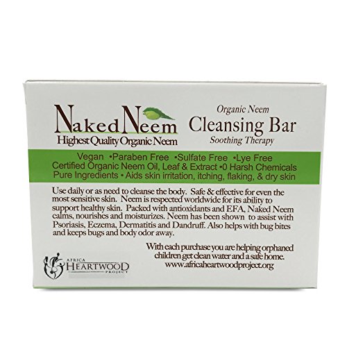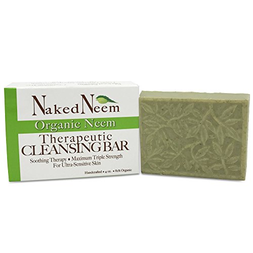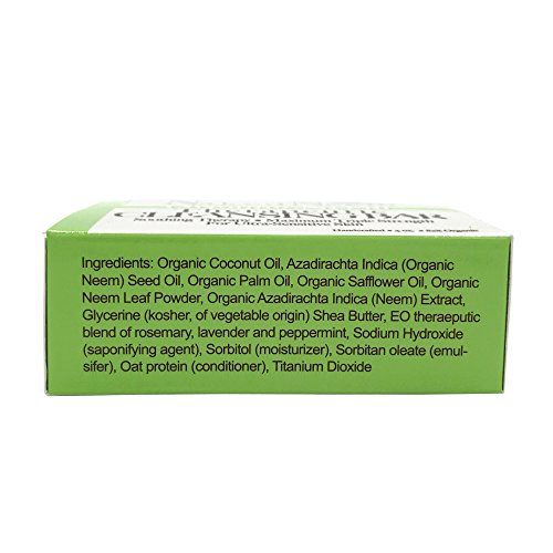 Maximum Strength For Sensitive Skin This the most concentrated organic neem bar available. •Shea Butter Base for added soothing therapy • NO Parabens • NO SLS • NO Gluten • NO Petrochemicals • NO Phthalates • NO Synthetic Ingredients • NO Fragrance • NO Lye • Vegan •Kosher • Non-GMO Ingredients •82% Organic The neem tree is known as "the miracle tree" Botanical Name: Azadirachta indica Packed with antioxidants, Neem can help protect and moisturize even the most sensitive skin. • Safe for all ages • pH balanced and conditioning • Assists dry skin, itching, skin irritation eczema, psoriasis, and dermatitis Hand-crafted with only the finest-quality organic oils and other all-natural ingredients. Variation in color may occur. Green spots are the organic neem leaf.Feature