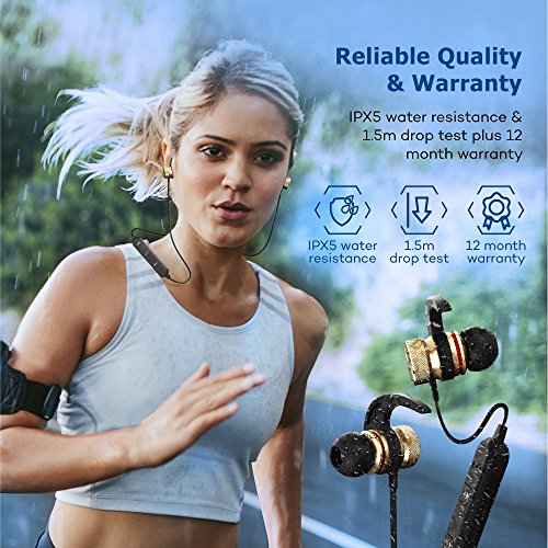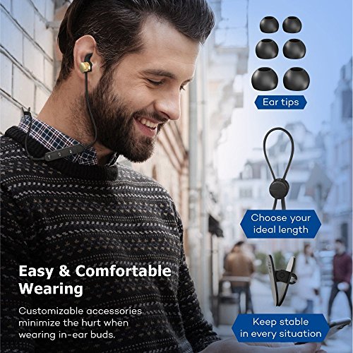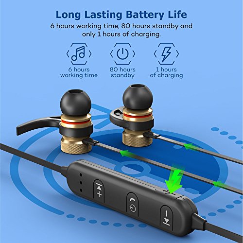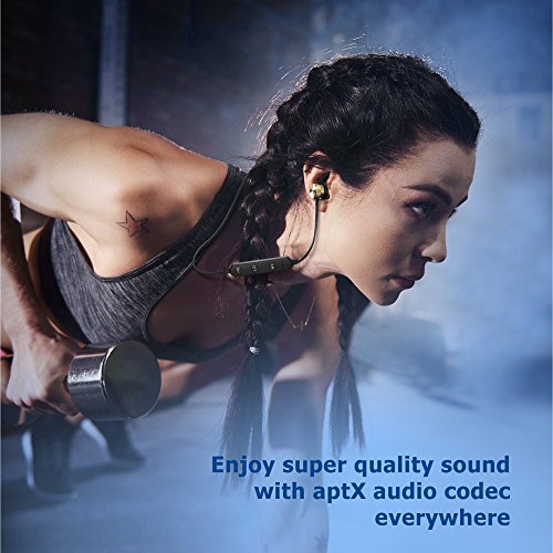 -. Feature : Advanced Sound Performance: With aptX audio codec, the stereo headsets produces super quality sound while providing the convenience of wireless streaming. / Market Leading Technology: Enjoy the latest Bluetooth V4.2 and CVC 6.0 noise canceling technology with this wireless earbuds. The headphones Support both iOS and Android devices. / Easy and Comfortable Wearing: The Bluetooth headphones come with customizable accessories. 3 pairs of different sized ear tips plus ergonomics ear hooks minimize the hurt when wearing in-ear buds. / Long Lasting Battery Life: Strong battery streams music for up to 6 hours after only 1 hours of charging and allows the earphone standby by up to 80 hours; Bluetooth 4.2 minimizes power consumption while providing a more stable and reliable connection. / Reliable Quality and Warranty: IPX5 water resistance protects the earbuds against rain and sweat. The headsets also passed 1.5m drop test, so you needn't worry about unexpected drop or shock. ❤30-day money back and 12-month free warranty❤ come with this product. Please feel free to reach our friendly customer support.