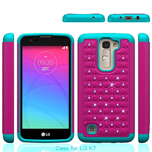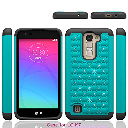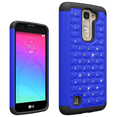 LG K7 Case, LG Tribute 5 Case, Easytop Slim Dual Layer Spot Diamond Hybrid Gel Crystal Rhinestone Bling Blue Hard Armor Shell + Black Shock-Absorption Soft Silicone Inner Bumper Defender Case Cover
