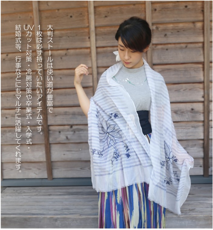 ★大判ストールは使い道が豊富で 1枚は必ず持っていたいアイテムです。 UVカット対策・冷房対策や卒業式・入学式・ 結婚式等、行事などにもマルチに活躍してくれます。