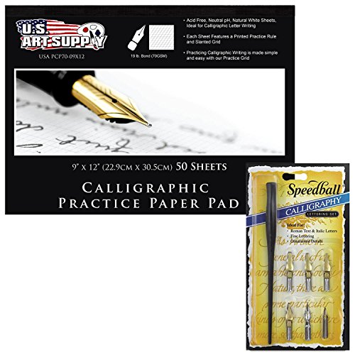 -. Feature : Calligraphy lettering set is ideal for roman text and italic letters / Fine lettering & Ornamental details / ontains 1 black plastic pen holder and nibs c1, c2, c3, c4, 100 and 152 / U.S. Art Supply 9" x 12" Premium Calligraphic Practice Paper Pad, 19 Pound Bond (70gsm), Pad of 50-Sheets, Calligraphy Paper with Printed Practice Rule and Slanted Grid / Paper is Acid Free, Neutral pH, Natural White Sheets, Ideal for Calligraphic Letter Writing